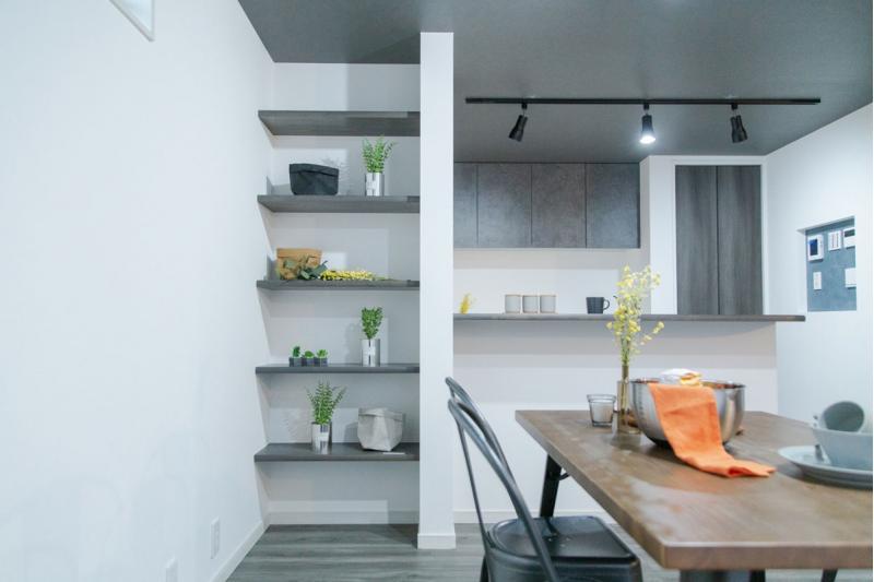 住宅ではあまり使用されないスポットライトを基本のメイン照明とし、リビングの棚もディスプレイとして使用出来るようにインテリアの細部にまでこだわっています。